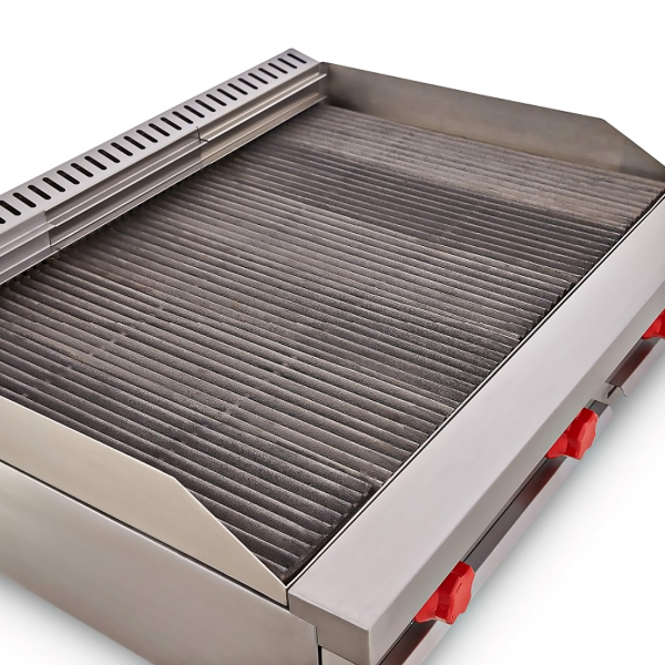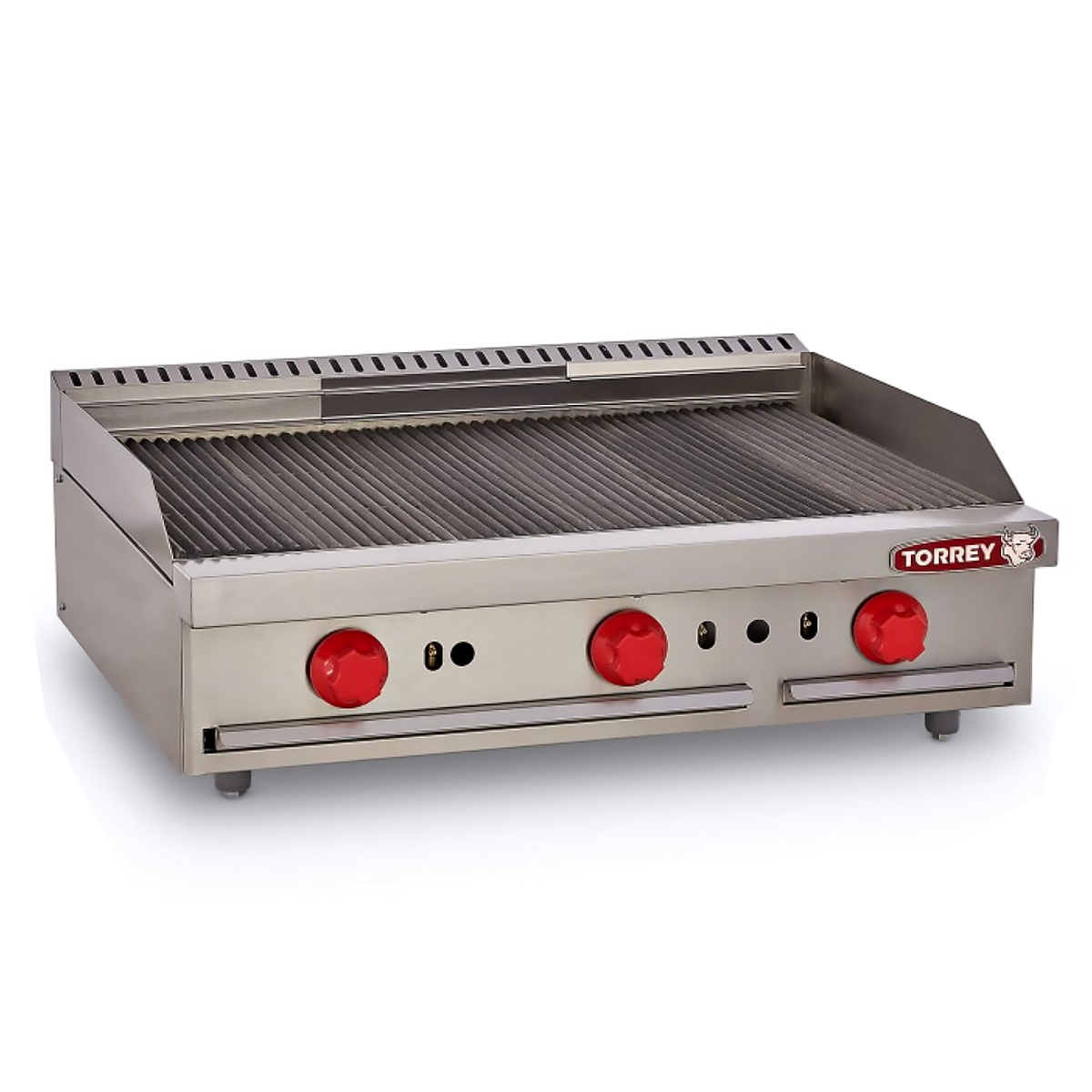 La plancha Torrey cuenta con 3 quemadores tipo H fabricados en acero inoxidable, estos quemadores maximizan el flujo de calor sobre toda la superficie de la plancha.