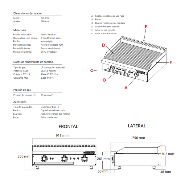 Asador modular de mesa de 2 quemadores de gas y 3 niveles, de fabricación modular para combinarlos con otros equipos de cocción y armar tu cocina ideal.