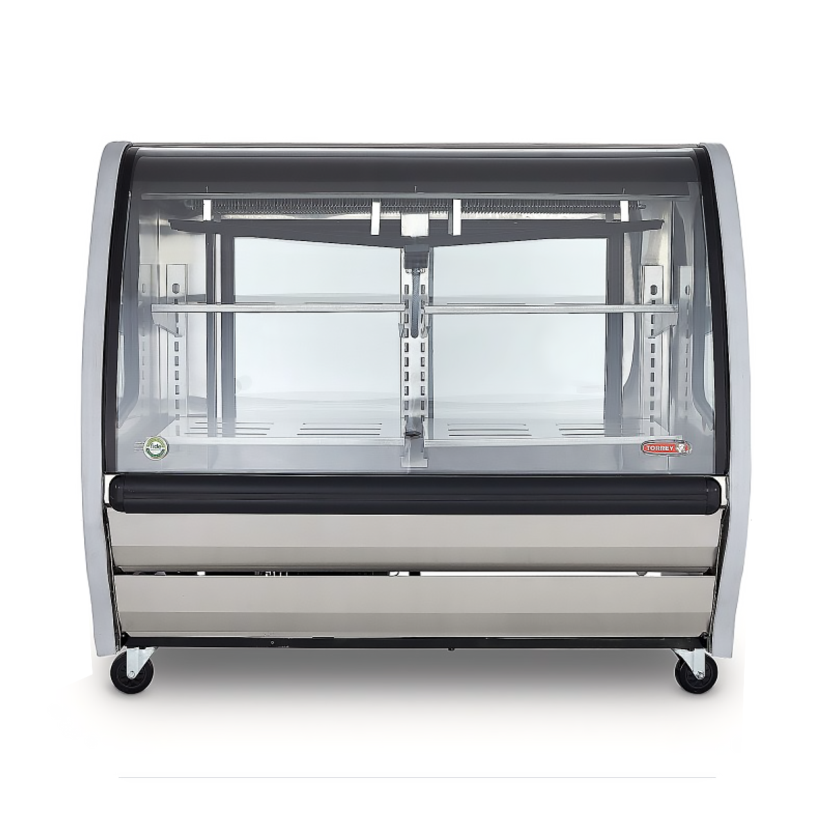 Vitrina delicatessen fabricada en acero inoxidable de 1.5 m para abarrotes y cremerías de tamaño mediano con dos niveles de exhibición y control digital de temperatura y puertas posteriores de cristal deslizables y desmontables.