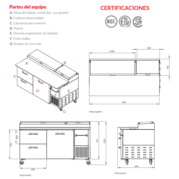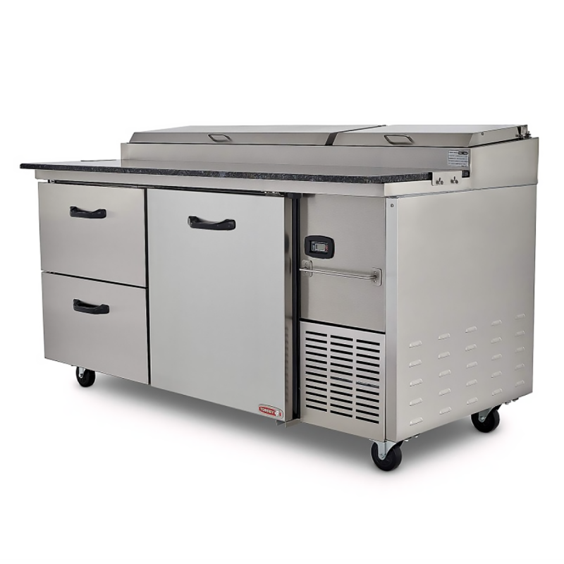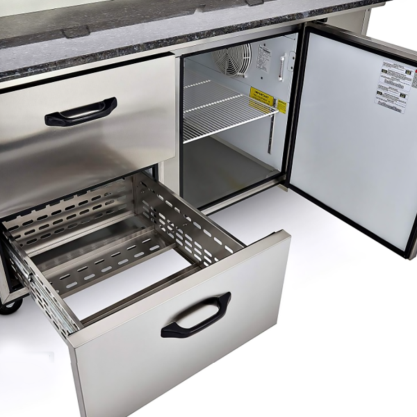 Mesa fría elaborada en acero inoxidable con placa de granito y 9 insertos de policarbonato de grado alimenticio y almacén y cajones refrigerados