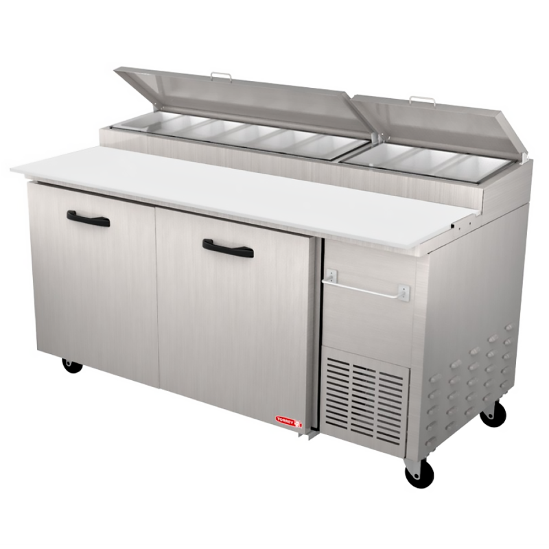 Mesa fría elaborada en acero inoxidable con placa de granito y 9 insertos de policarbonato de grado alimenticio y almacén y cajones refrigerados