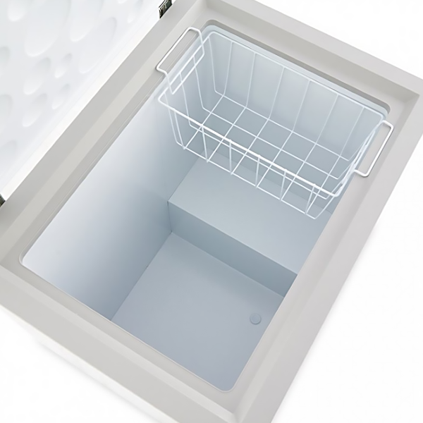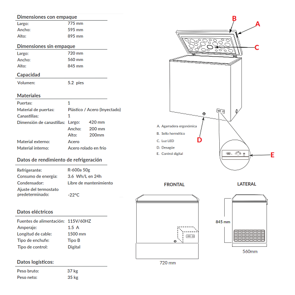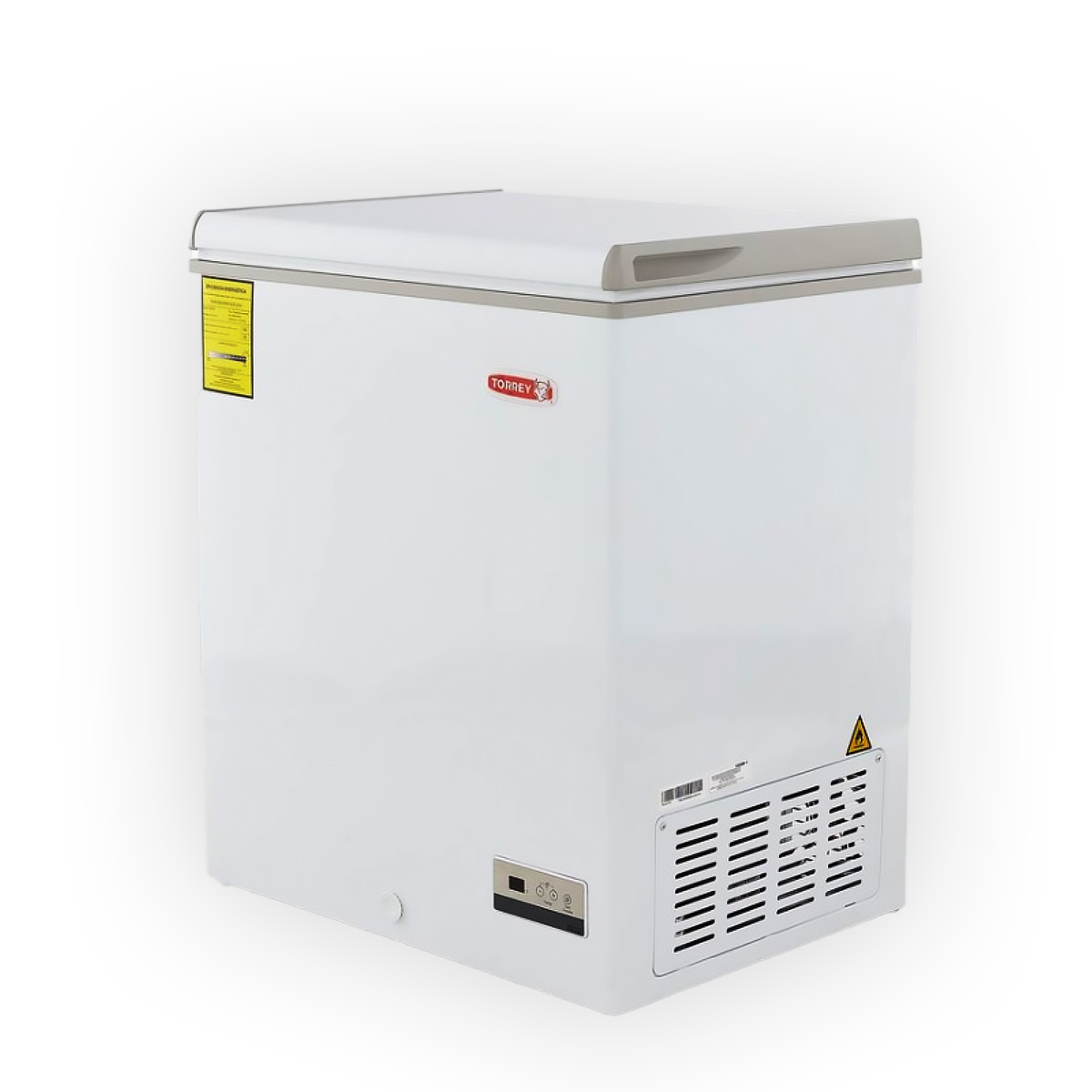 Congelador horizontal con tapa tipo cofre de 5.2 pies3 de capacidad, con sistema dual de refrigeración o congelación e interior de acero embozado pintado.