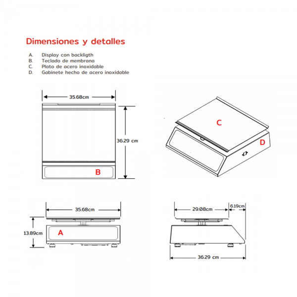 Construida en acero inoxidable, batería recargable de 100hrs. aprox. eliminador incluido, 100 memorias de precio, funciones de caja registradora, 8 teclas de acceso directo, función de precio fijo, plato de 29 x 35 cm, backlight, cable de alimentación integrado, conexión USB.