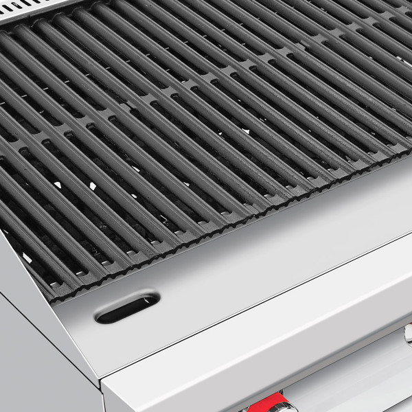 3 parrillas reversibles de hierro fundido, área útil de: frente: 0.290 m, fondo: 0.540 m cada una.