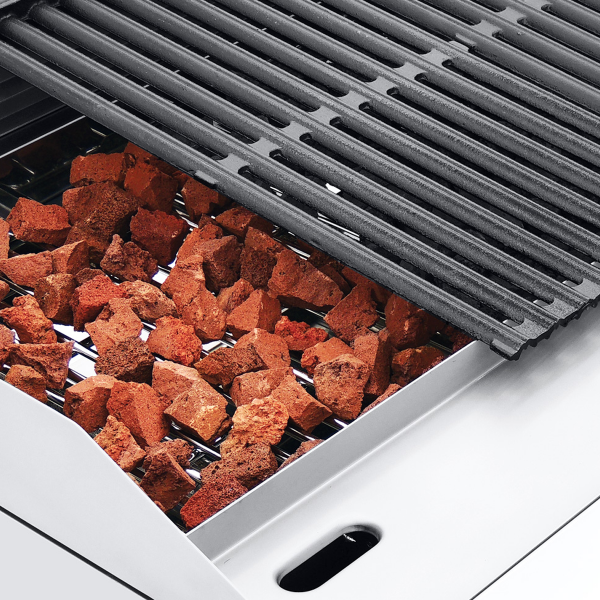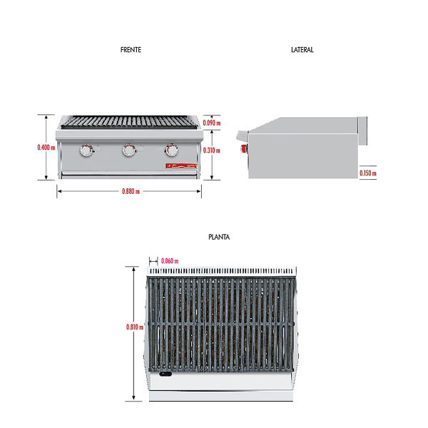 Asador a gas, con 3 parrillas reversibles área útil frente: 0.870 m, fondo: 0.540 y 1 capa de piedra volcánica refractaria