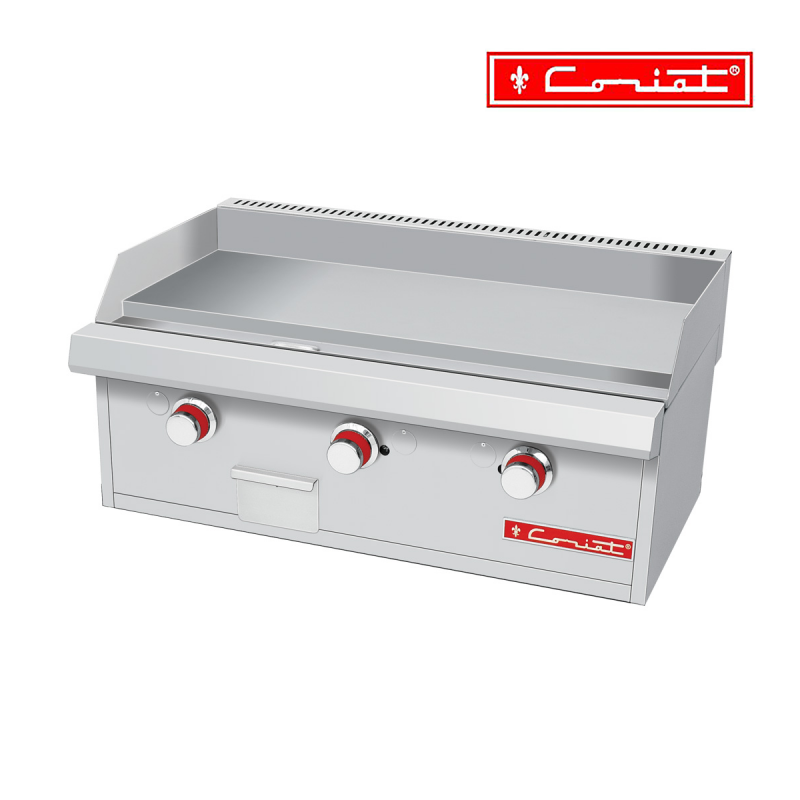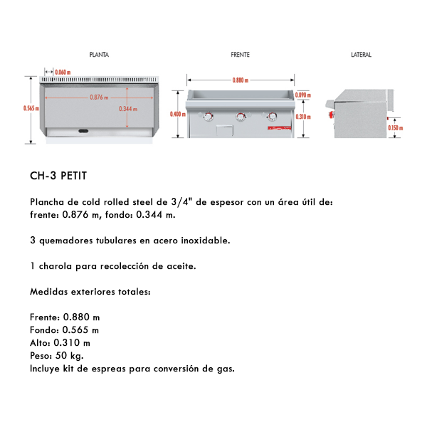 Plancha a gas, con 3 quemadores tubulares, placa de 3/4" de espesor, área útil: frente: 0.876 m, fondo: 0.344 m