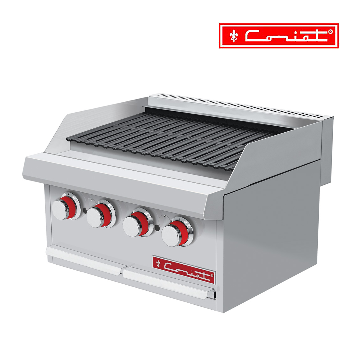 Asador a gas, con 2 parrillas reversibles, área útil frente: 0.580 m, fondo: 0.340 y 1 capa de piedra volcánica refractaria