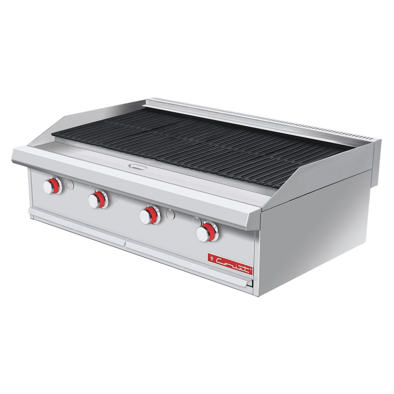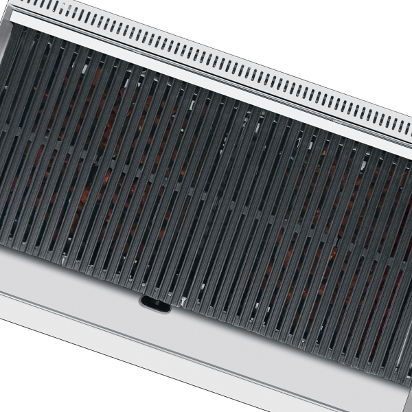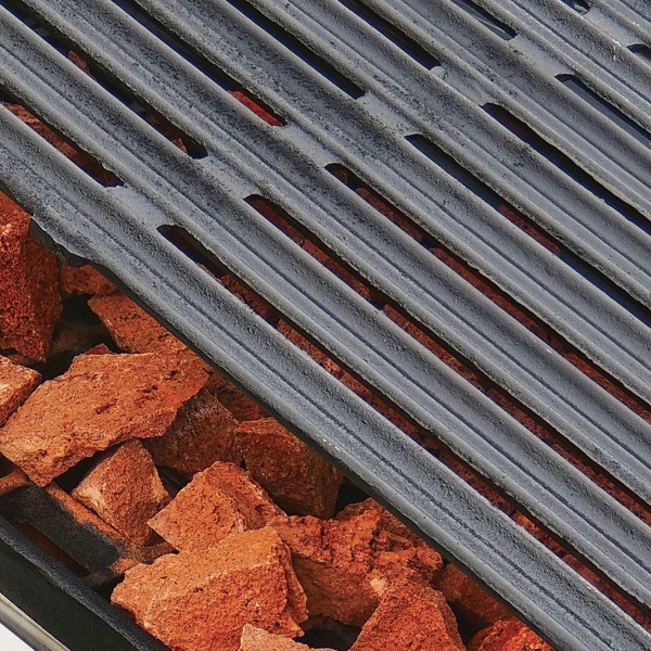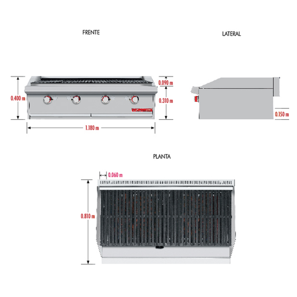 Asador a gas, con 4 parrillas reversibles área útil de: frente: 1.160 m, fondo: 0.540 m y 1 capa de piedra volcánica refractaria.